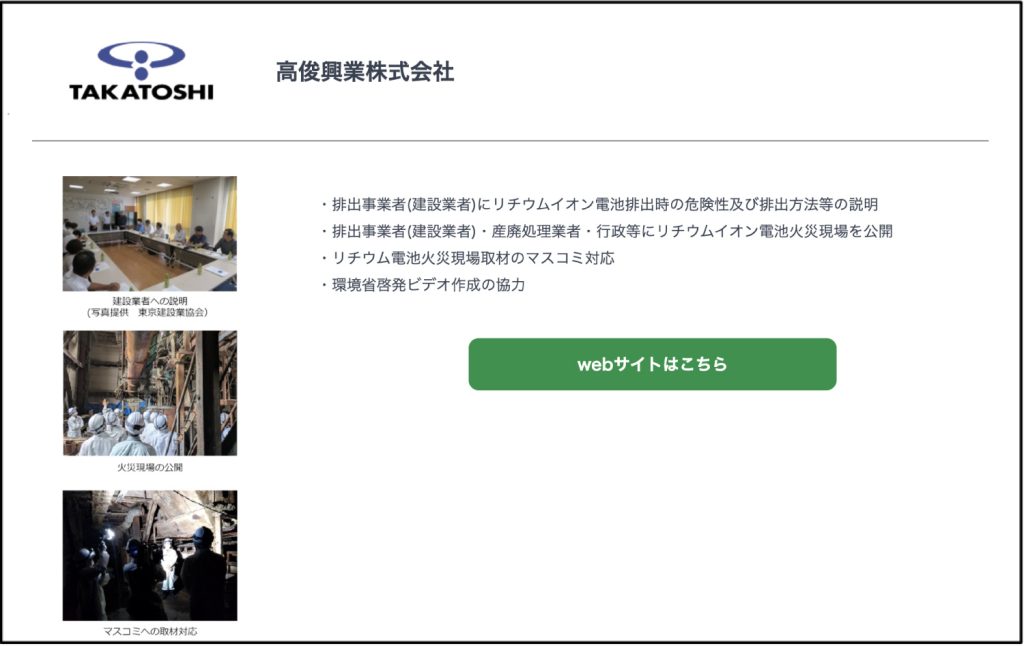 高俊興業株式会社は、2025 年 5 月に発生したリチウム電池混入が原因による火災の経験を踏まえ、同様の火災を防ぐための啓発活動を進めており、環境省のLiB*パートナー」に登録することにより、引き続きリチウムイオン電池混入廃棄による発煙・発火の危険性や適切な廃棄方法等に関する周知・啓発を実施します。