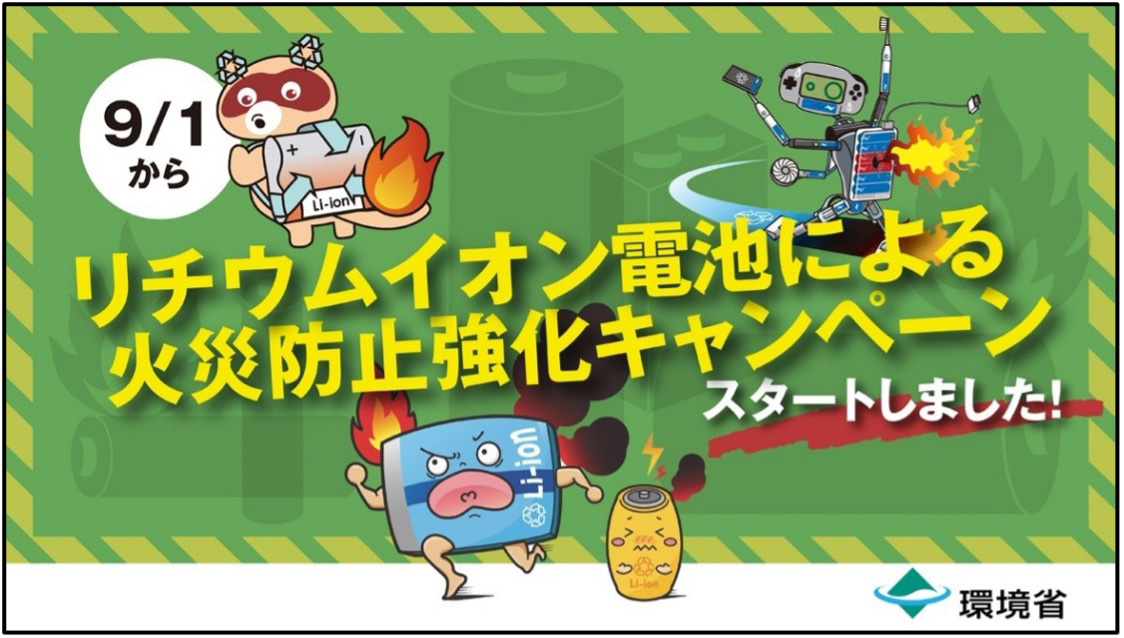 環境省は、近年多発しているリチウムイオン電池使用製品による使用廃棄時の火災事故を防ぐため、2025年9月~12月までを リチウムイオン電池による火災防止強化キャンペーン」期間、同年11月を リチウムイオン電池による火災防止月間」とし、リチウムイオン電池による火災防止に関する周知・啓発を強化することを発表しました。