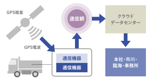 GPSは「Global Positioning System」の略で、全地球測位システムを表します。地球の周回軌道を回る30個の衛星から発信される電波を受信し、現在地の緯度・経度を計算するシステムです。 車載端末がGPS衛星の電波を受信し位置情報を取得、その情報が本社端末に送られ、地図上に車両位置が表示されます。合わせにも即座に対応できるものとしています。